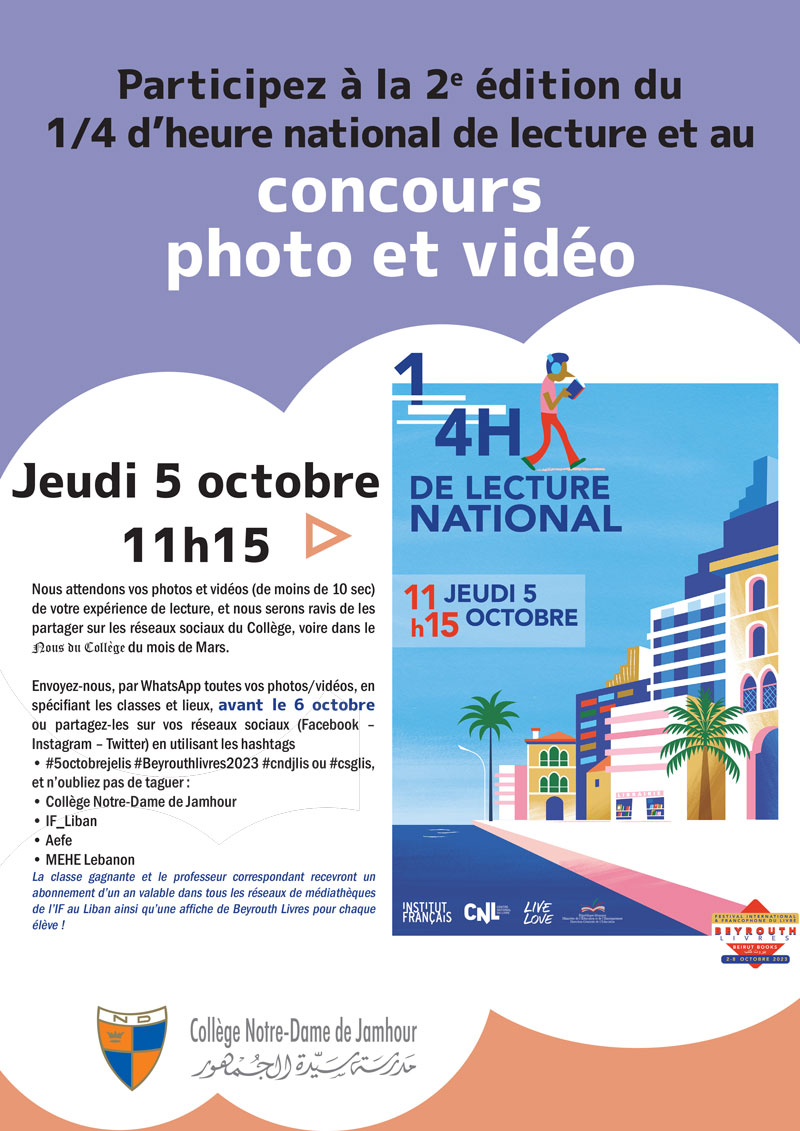 Participez à la 2e édition du 1/4 d’heure national de lecture et au concours photo et vidéo (05.10.2023)