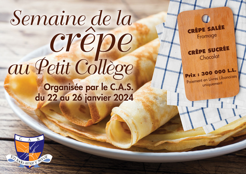 Le C.A.S. organise, comme chaque année, sa traditionnelle "Semaine de la crêpe"* qui vise à financer ses activités sociales**. Elle aura lieu du lundi 22 au vendredi 26 janvier 2024 au Petit Collège.