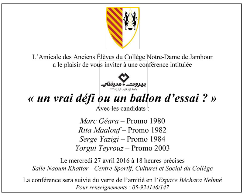 Les intervenants sont les candidats : Marc Géara (promo 1980), Rita Maalouf (Promo 1982), Serge Yazigi (Promo 1984) et Yorgui Teyrouz (Promo 2003).