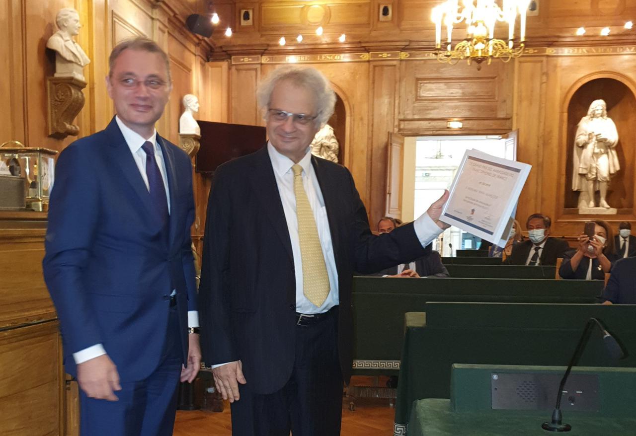 | Amin Maalouf recevant son prix des mains du président du groupe, Luca Niculescu. Photo GAFF/Twitter |