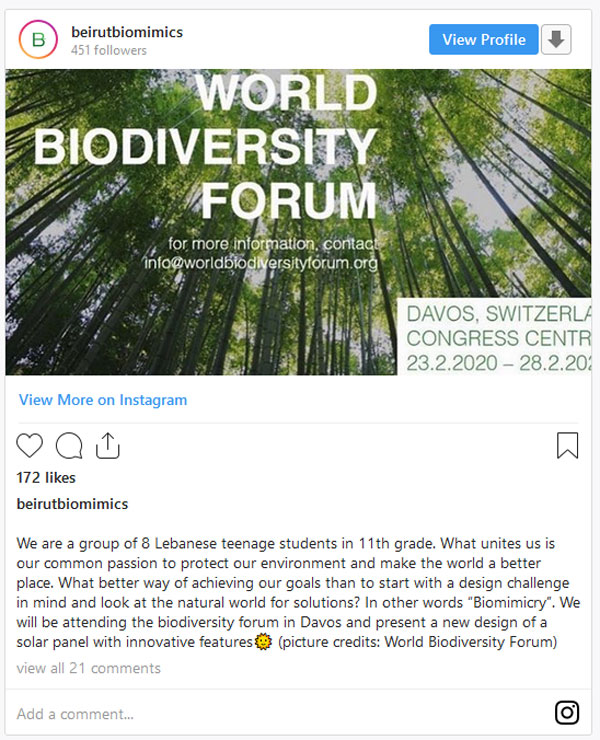 ???? ???? "Beirut Biomimics" ?????? ??????? ????????? ?????? "Born Global Foundation"? ???? ????? ??? ??????? ?? ??????? ??? "??????? ??????? ?????? ??????????". ??? ?????? ????? ?? ???? ????? ?????? ?? ??????? ?? ????? ??????? ????? ??????? ??????? ??????? ????????? ?????????. ????? ?????? ?? ??????? ??? ??????? ??? ???? ??????? ??????? ?? 23 ????? ?????? ???28 ???. ???? ???? ?????? ?? ????? ????? ?? ???????? ???? ??????? ????? "???? ???????" ?????? ????? ?????? ?? ????? ??????? ???? ???? ????? ??? ??????? ??????? ?? ???????? ???????? ????????? ???????? ??????? ????????.