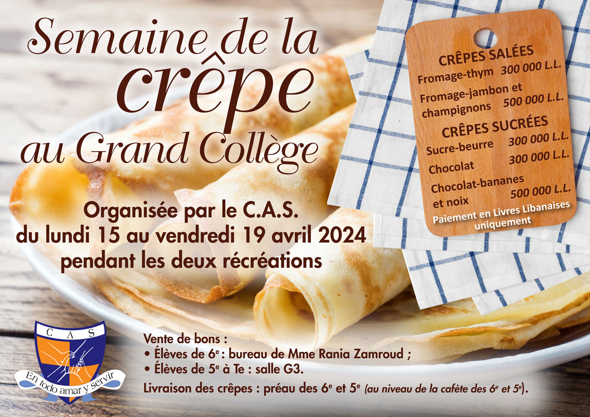 Le C.A.S. organise sa traditionnelle "Semaine de la crêpe" qui vise à financer ses activités sociales. Elle aura lieu du lundi 15 au vendredi 19 avril 2024 au Grand Collège, pendant les deux récréations.