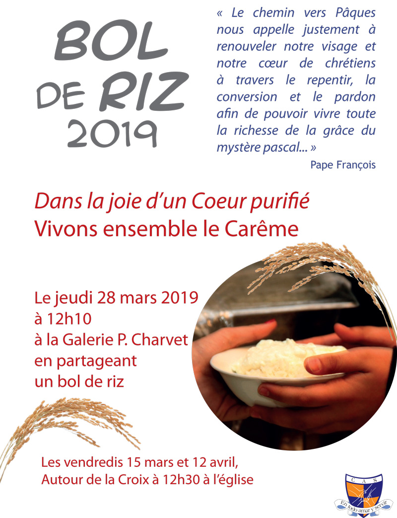 Nous t’invitons, le jeudi 28 mars 2019 à 12h10, à un acte de solidarité : un déjeuner frugal constitué d’un bol de riz accompagné de laban, vendu à 3.000 L.L. à la Galerie P. Charvet.