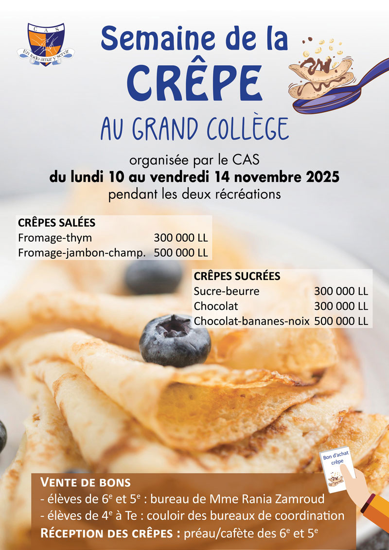 Le Comité d’activités sociales (CAS) organise sa traditionnelle "Semaine de la crêpe" qui vise à financer ses activités régulières. Elle aura lieu du lundi 10 au vendredi 14 novembre 2025 au Grand Collège, pendant les deux récréations.