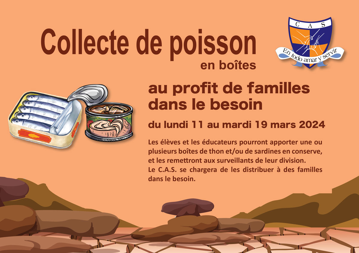 Du lundi 11 au mardi 19 mars 2024, les élèves et les éducateurs pourront apporter une ou plusieurs boîtes de thon et/ou de sardines en conserve, et les remettront aux surveillants de leur division.