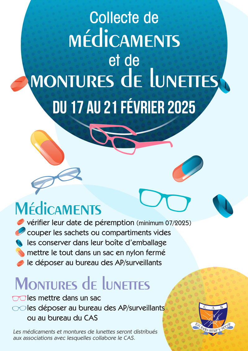 À l'occasion de la Journée Mondiale du Malade, le 11 février, le Comité d’activités sociales (CAS) lance sa collecte de médicaments et de montures de lunettes, du lundi 17 au vendredi 21 février 2025. Les articles collectés seront triés et redistribués aux associations avec lesquelles il collabore.