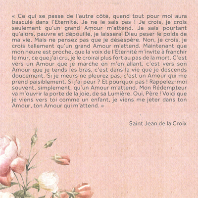 « Ce qui se passe de l’autre côté, quand tout pour moi aura basculé dans l’Eternité. Je ne le sais pas ! Je crois, je crois seulement qu’un grand Amour m’attend. Je sais pourtant qu’alors, pauvre et dépouillé, je laisserai Dieu peser le poids de ma vie. Mais ne pensez pas que je désespère. Non, je crois, je crois tellement qu’un grand Amour m’attend. Maintenant que mon heure est proche, que la voix de l’Eternité m’invite à franchir le mur, ce que j’ai cru, je le croirai plus fort au pas de la mort. C’est vers un Amour que je marche en m’en allant, c’est vers son Amour que je tends les bras, c’est dans la vie que je descends doucement. Si je meurs ne pleurez pas, c’est un Amour qui me prend paisiblement. Si j’ai peur ? Et pourquoi pas ! Rappelez-moi souvent, simplement, qu’un Amour m’attend. Mon Rédempteur va m’ouvrir la porte de la joie, de sa Lumière. Oui, Père ! Voici que je viens vers toi comme un enfant, je viens me jeter dans ton Amour, ton Amour qui m’attend. » (Saint Jean de la Croix)