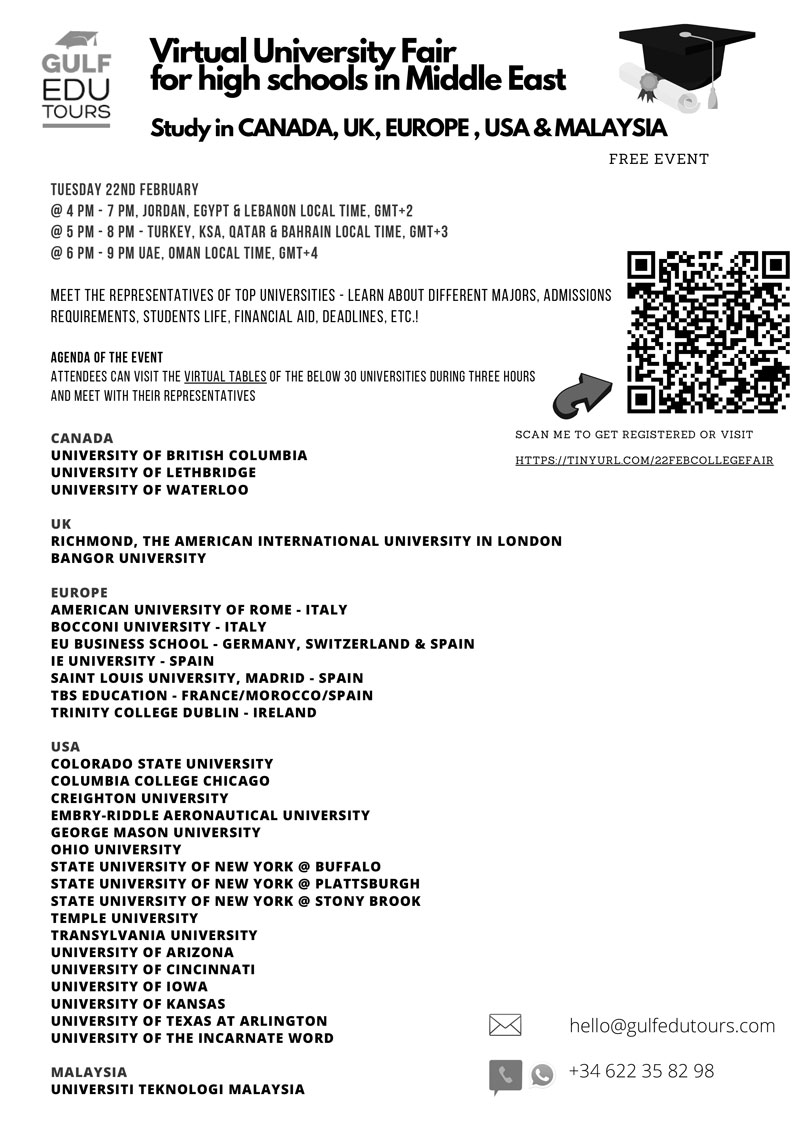 Gulf EDU Tours (www.gulfedutours.com) would like to invite students, parents & Career Counselors to its Virtual University Fair for high schools in Lebanon on 22nd of February @ 4 pm – 7 pm, Lebanon local time.