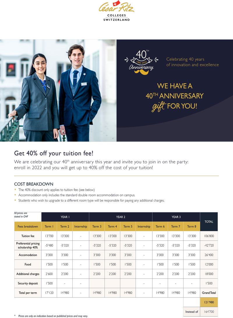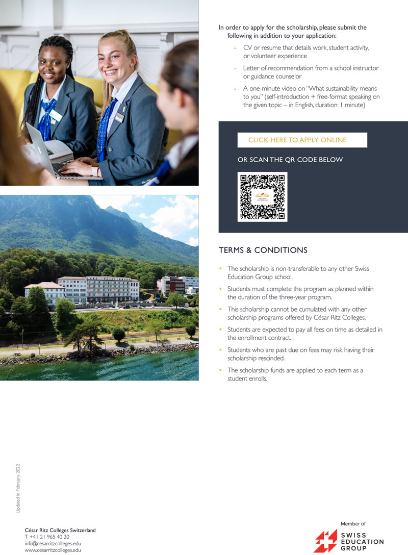 If you are interested in hospitality management schools, you can apply for a scholarship in César Ritz Colleges Switzerland (www.cesarritzcolleges.edu).