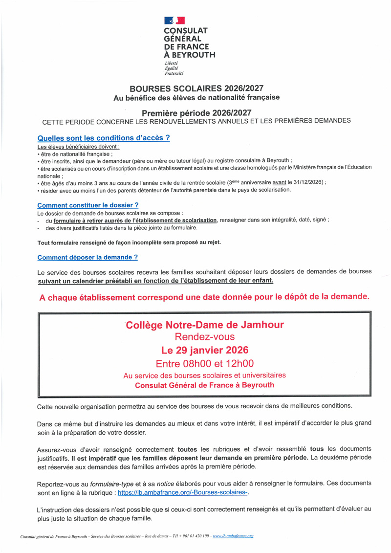 Les familles françaises dont les enfants sont scolarisés au Collège Notre-Dame de Jamhour, et qui souhaitent y souscrire, doivent soumettre leur dossier le jeudi 29 janvier 2026, entre 8h et 12h.
