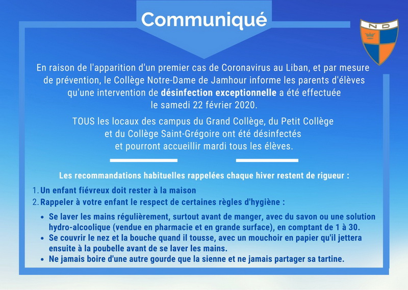 En raison de l'apparition d'un premier cas de Coronavirus au Liban, et par mesure de prévention, le Collège Notre-Dame de Jamhour informe les parents d'élèves qu'une intervention de désinfection exceptionnelle a été effectuée le samedi 22 février 2020.