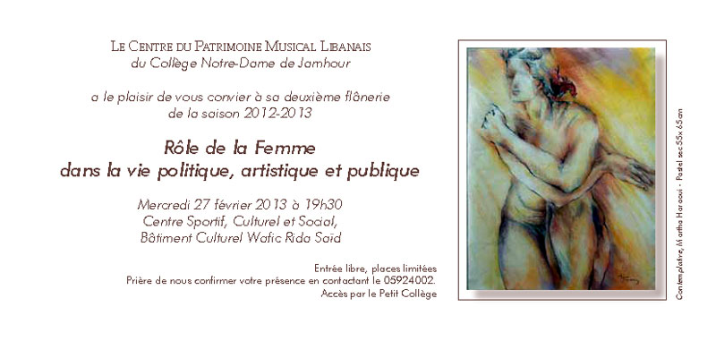 L’Orient-Le Jour > Agenda > Rôle de le la femme dans la vie politique, artistique et publique au centre du patrimoine libanais de NDJ