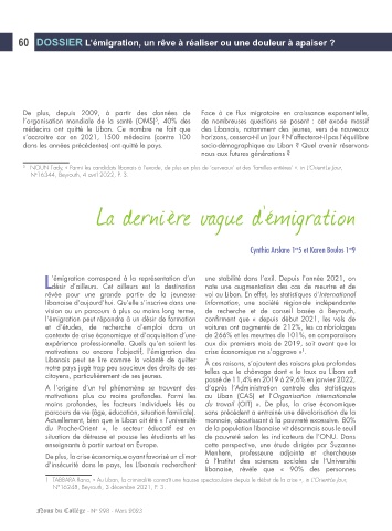 5 NOUN Fady, « Parmi les candidats libanais à l’exode, de plus en plus de ‘cerveaux’ et des ‘familles entières’ ». in L’Orient-Le Jour,