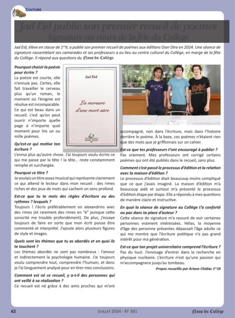 Jad Eid, élève en classe de 1 9, a publié son premier recueil de poèmes aux éditions Oser Dire en 2024. Une séance de