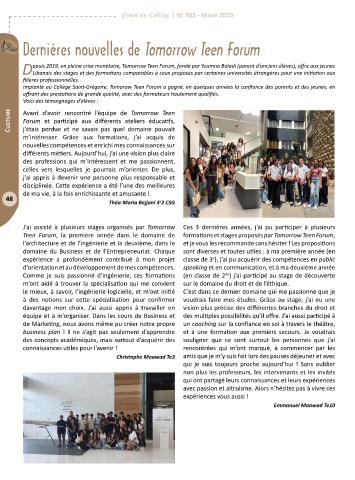 Implanté au Collège Saint-Grégoire, Tomorow Teen Forum a gagné, en quelques années la confiance des parents et des jeunes, en