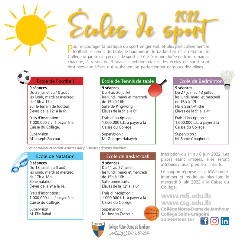 Pour encourager la pratique du sport en général, et plus particulièrement le football, le tennis de table, le badminton, le basket-ball et la natation, le Collège organise cinq écoles de sport cet été 2022. Sur une durée de trois semaines chacune, à raison de trois séances hebdomadaires, les écoles de sport sont destinées aux élèves qui souhaitent se perfectionner dans ces disciplines.