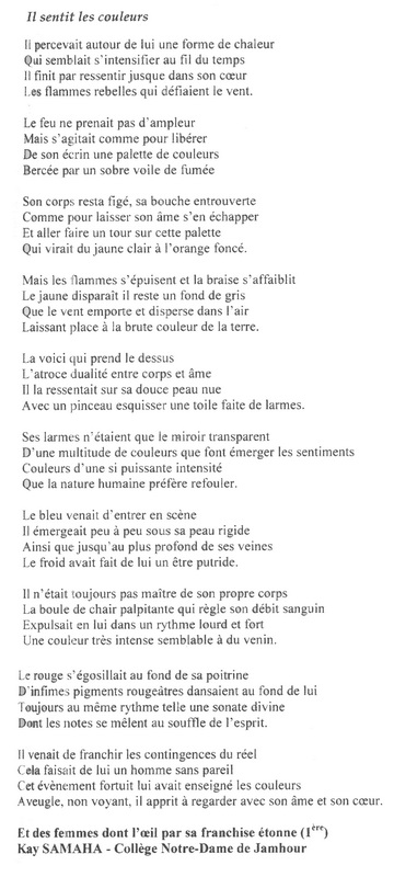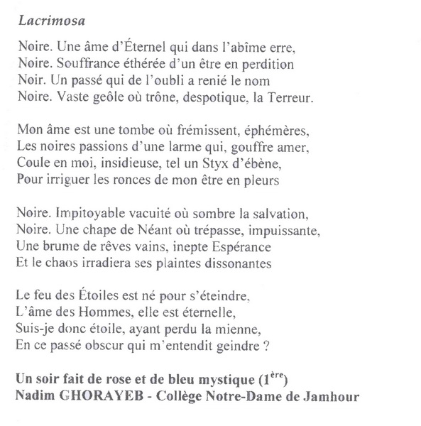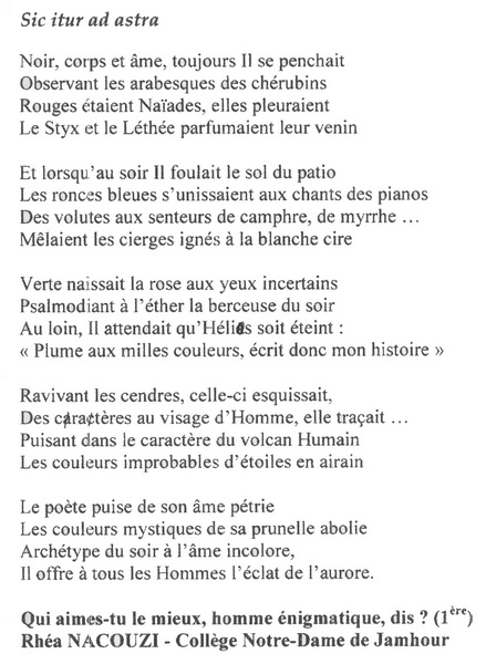 C’est dans le nouvel auditorium Irani de l’IC que s’est déroulée, le 12 avril 2013, la remise des prix. Lors de la cérémonie nous avons été très heureux de retrouver Rhéa Nacouzi et Kay Samaha (classe de 1re) et Mira Hajjar (classe de 3e), trois élèves du Collège, parmi les six lauréats. Félicitations également à Nadim Ghorayeb (classe de 1re) dont le poème a été remarqué par les membres du jury, ainsi qu’à Saadallah Yazigi et Marc Faycal (classe de 3e) pour leur honorable participation. Nous sommes très fiers d’avoir goûté au plaisir de ce concours unique en son genre et d’avoir levé haut les couleurs de notre Collège. Merci à monsieur Daniel Tinawi qui nous a accompagnés aussi bien le jour du concours que lors de la remise des prix et qui a su nous soutenir et nous motiver.