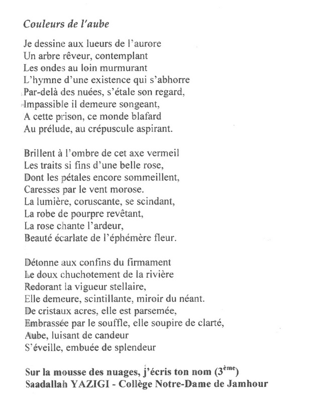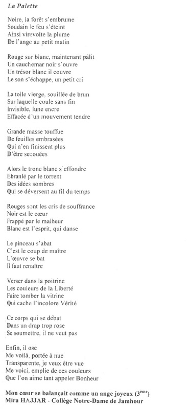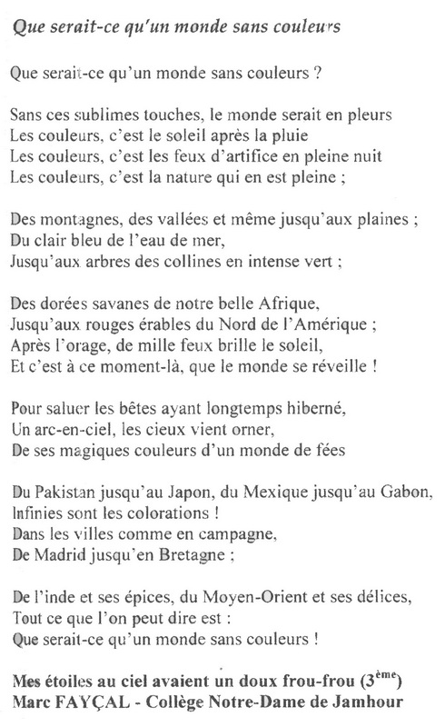 C’était le 12 avril 2013, nous sommes de retour à l’IC, dévisageant le public, les jurés, d’un regard qui chercherait à puiser de l’impatience le suspend le plus long… Après quelques photographies, en présence du représentant du centre culturel français, M. Roche, les résultats tant attendus tombèrent comme la foudre qui se retournerait vers les nuages… Je tiens à honorer la participation victorieuse de Rhéa Nacouzi (1er prix, classe de 1re), Kay Samaha (3e prix, classe de 1re) et de Mira Hajjar (2e prix, classe de 3e, CSG) qui ont su hisser l’étendard de notre Collège parmi les couleurs de la poésie. Aspirant pour ma part d’arborer la prochaine fois un trophée aux couleurs de notre Collège… il ne faut pas que je désespère… le désespoir est une défaite devancée.