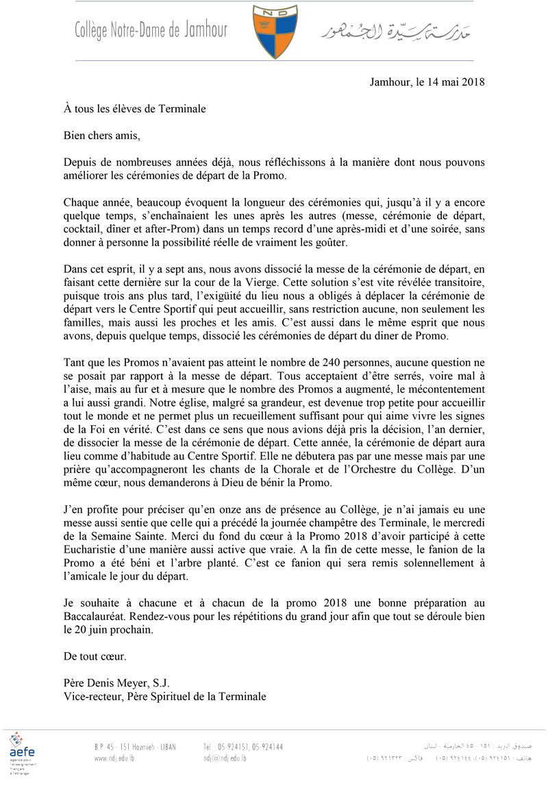 Tant que les Promos n’avaient pas atteint le nombre de 240 personnes, aucune question ne se posait par rapport à la messe de départ. Tous acceptaient d’être serrés, voire mal à l’aise, mais au fur et à mesure que le nombre des Promos a augmenté, le mécontentement a lui aussi grandi. Notre église, malgré sa grandeur, est devenue trop petite pour accueillir tout le monde et ne permet plus un recueillement suffisant pour qui aime vivre les signes de la Foi en vérité. C’est dans ce sens que nous avions déjà pris la décision, l’an dernier, de dissocier la messe de la cérémonie de départ. Cette année, la cérémonie de départ aura lieu comme d’habitude au Centre Sportif. Elle ne débutera pas par une messe mais par une prière qu’accompagneront les chants de la Chorale et de l’Orchestre du Collège. D’un même coeur, nous demanderons à Dieu de bénir la Promo.