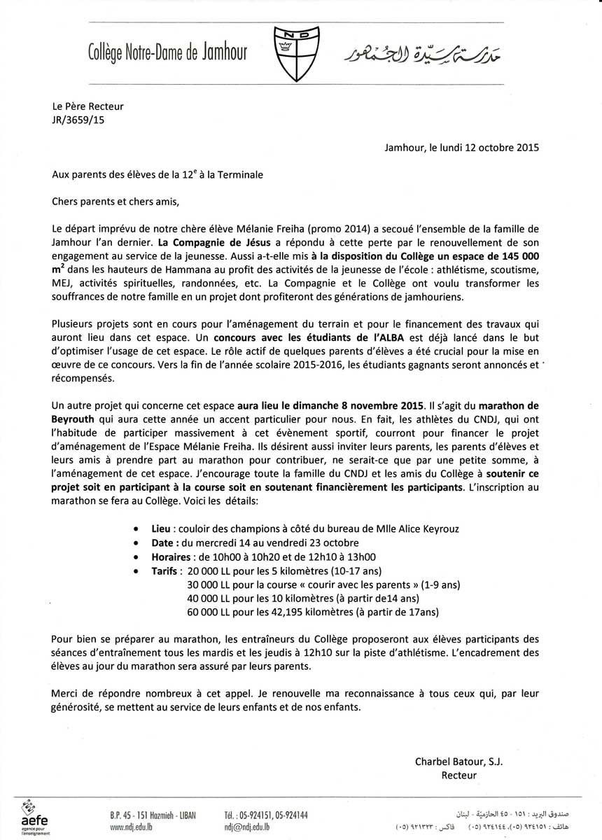 Un autre projet qui concerne cet espace aura lieu le dimanche 8 novembre 2015. Il s’agit du marathon de Beyrouth qui aura cette année un accent particulier pour nous. En fait, les athlètes du CNDJ, qui ont l’habitude de participer massivement à cet évènement sportif, courront pour financer le projet d’aménagement de l’Espace Mélanie Freiha. Ils désirent aussi inviter leurs parents, les parents d’élèves et leurs amis à prendre part au marathon pour contribuer, ne serait-ce que par une petite somme, à l’aménagement de cet espace. J’encourage toute la famille du CNDJ et les amis du Collège à soutenir ce projet soit en participant à la course soit en soutenant financièrement les participants.