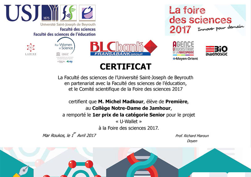 Comme de coutume, nos élèves se distinguent chaque année aux concours scientifiques et technologiques. Les 30, 31 mars et 1er avril 2017 (à Mar Roukoz), à l’occasion du 20e anniversaire de la Faculté des sciences de l’Université Saint-Joseph de Beyrouth, l’USJ a lancé le concours Foire des sciences 2017, « Innover pour demain », en partenariat avec la Faculté des sciences de l’éducation, et ce sous le haut patronage de son excellence M. Marwan Hamadé, ministre de l’éducation nationale et de l’enseignement supérieur.