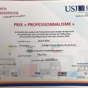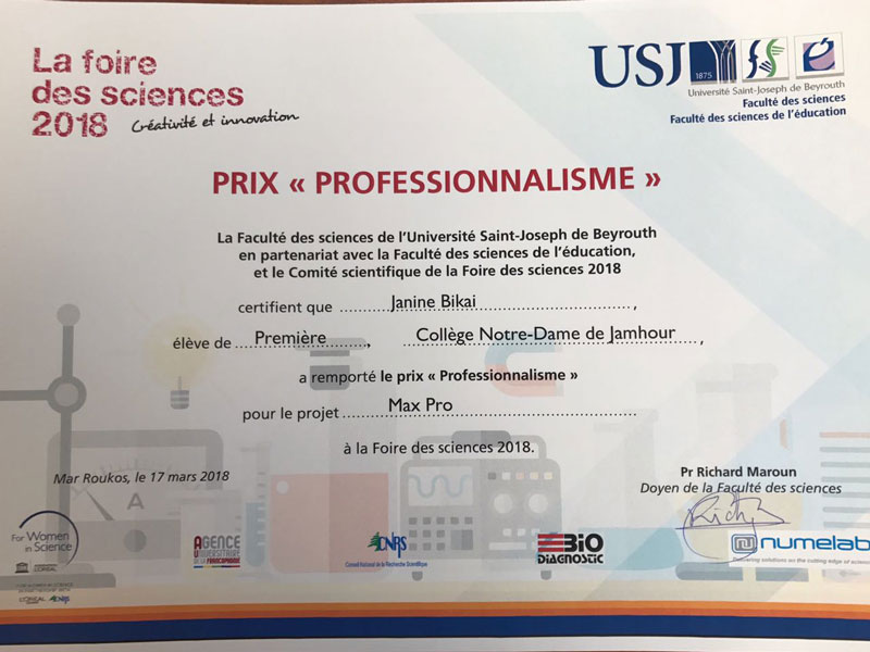 Les élèves du Collège se sont encore une fois distingués en remportant le prix « professionnalisme » pour le projet MAX PRO, réalisé par Ryan Dib Nehmé (1re1), Janine Bikai (1re1), Carl Moussallem (2de3), William Abou Khalil (2de5) et Marco Karam (2de2) ainsi que le deuxième prix de la catégorie junior pour le projet ADP (assistant de plage) de Yvana Mouawad (5e3), Marie-Claire Karam (4e3), Rami Rached (5e3) et Karl Nakhlé (4e7).