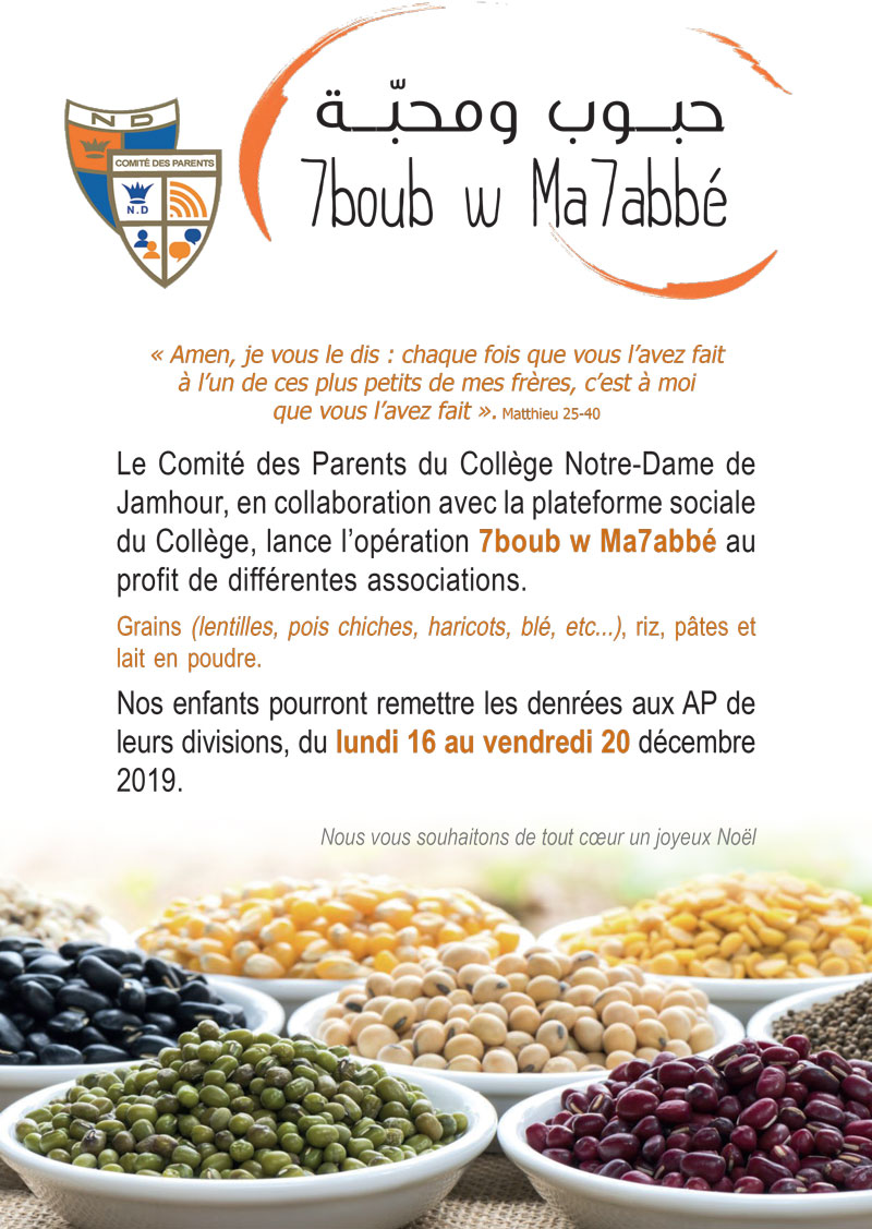 Le Comité des Parents du Collège Notre-Dame de Jamhour, en collaboration avec la plateforme sociale du Collège, lance l’opération 7boub w Ma7abbé au profit de différentes associations.