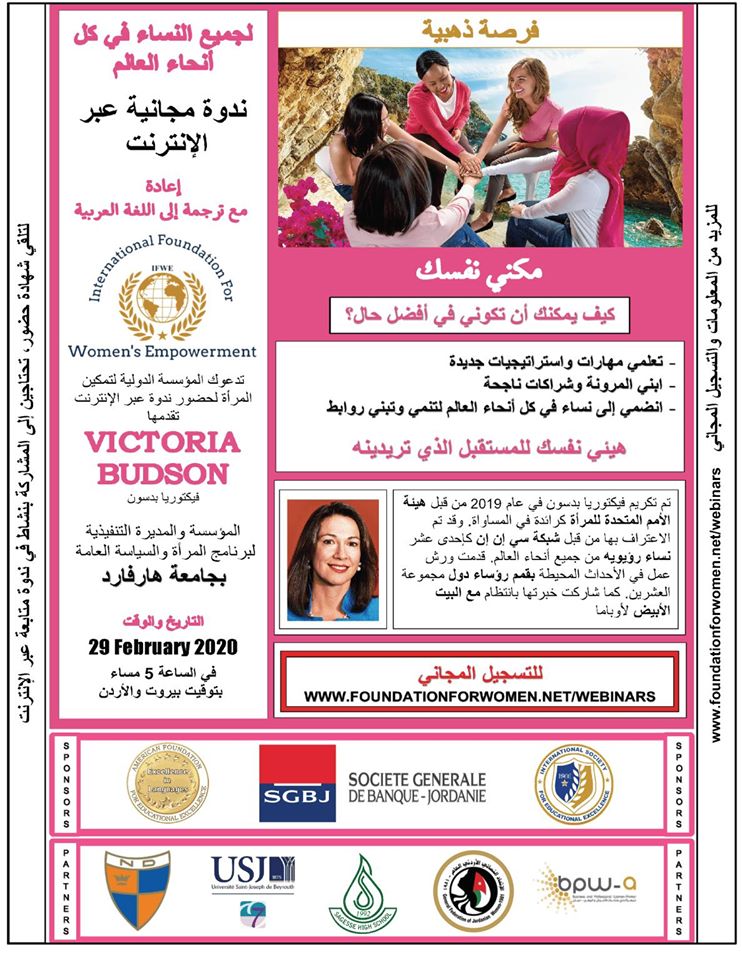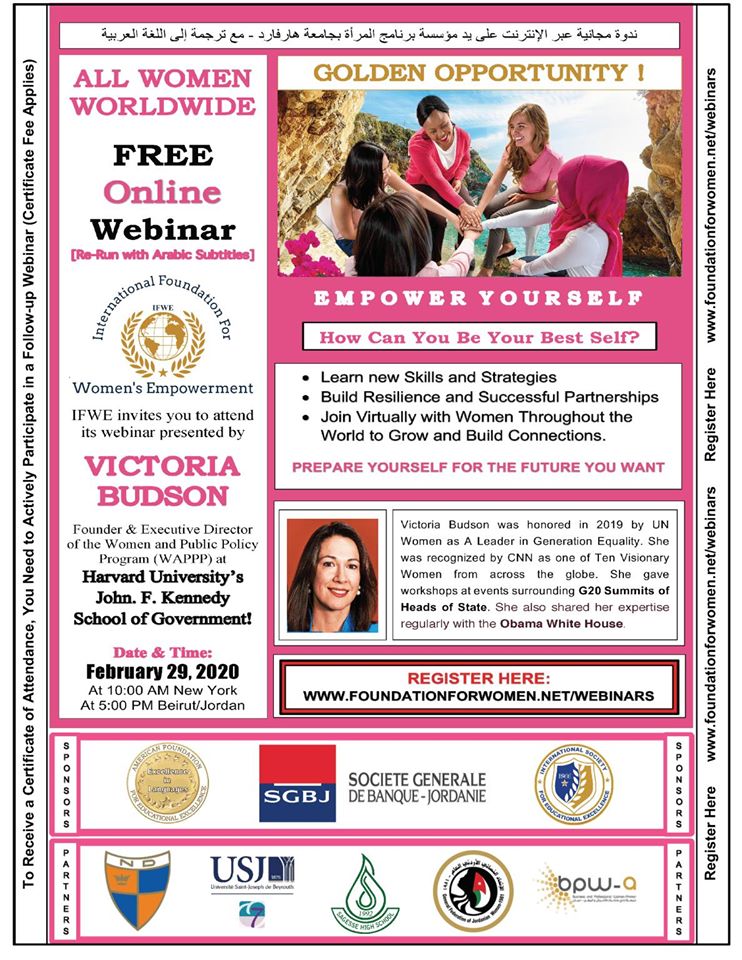 En vous rendant sur le site suivant : WWW.FOUNDATIONFORWOMEN.NET/WEBINARS, vous pourrez assister, gratuitement et en temps réel, à des visioconférences données par des experts en la matière.