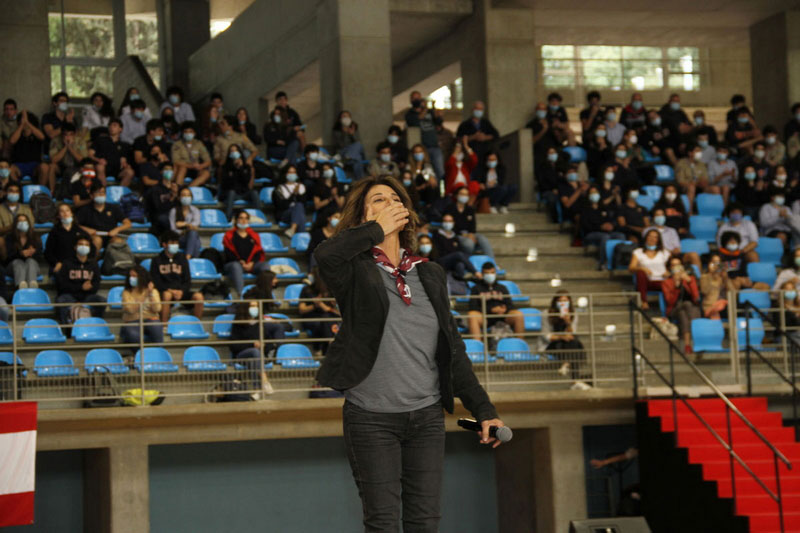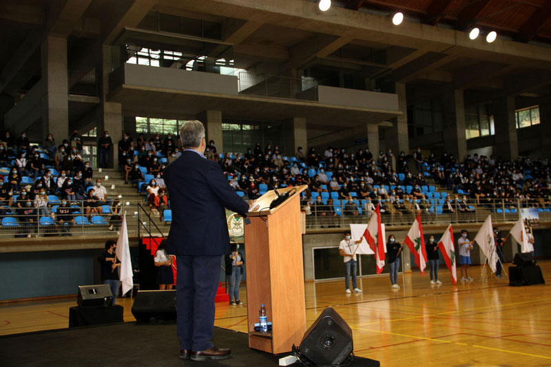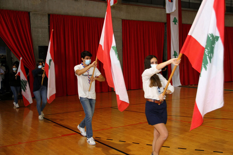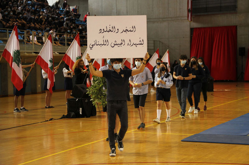 Les délégués de Terminale ont débuté la cérémonie par un défilé en hommage à l’armée libanaise, en déposant une couronne de fleurs aux pieds de la Vierge Marie. En mémoire des victimes et des martyrs tombés pour notre pays, Tamara Tayah a déposé une gerbe au pied de Notre Dame et observé, avec l’assemblée, un temps de silence et de recueillement.