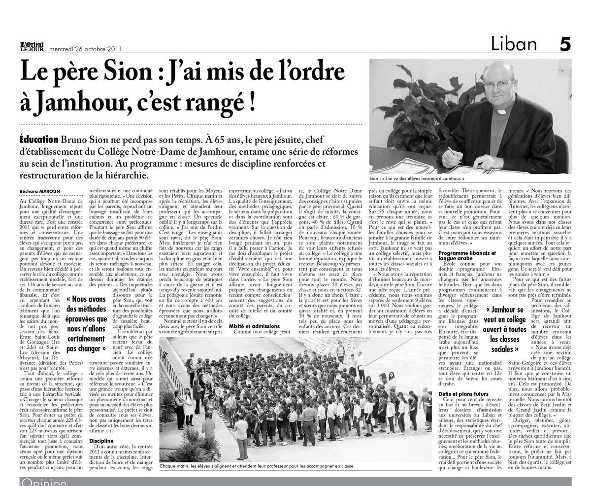 Éducation Bruno Sion ne perd pas son temps. À 65 ans, le père jésuite, chef d’établissement du Collège Notre-Dame de Jamhour, entame une série de réformes au sein de l’institution. Au programme : mesures de discipline renforcées et restructuration de la hiérarchie.