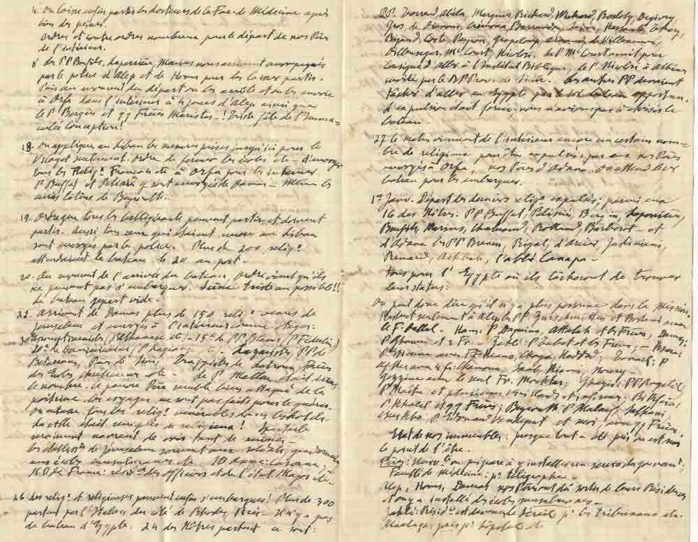 « Nous sommes sur un petit bateau construit pour une cinquantaine de personnes, presque 500 religieux et religieuses de toutes les congrégations, jésuites, maristes, lazaristes, dominicains, capucins, franciscains... Le voyage sera horrible, le prix aussi (...). Mais à peine le bateau eut-il levé l’ancre du port de Beyrouth qu’un joyeux Ave Maria s’échappa de toutes les bouches et tous les cœurs. Marie avait sauvé ses enfants de la main des barbares turco-allemands. »