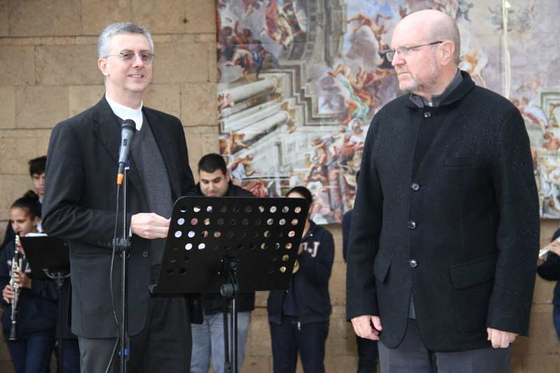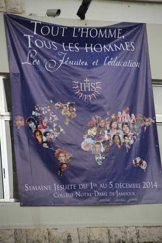 Le ciel gris et pluvieux de ce lundi 1er décembre 2014 n’a pas empêché le Collège Notre-Dame de Jamhour d’ouvrir joyeusement la semaine jésuite à 12h15 sur la cour de la Vierge. Cette 5e édition est placée cette année sous le thème des Jésuites et l’éducation.