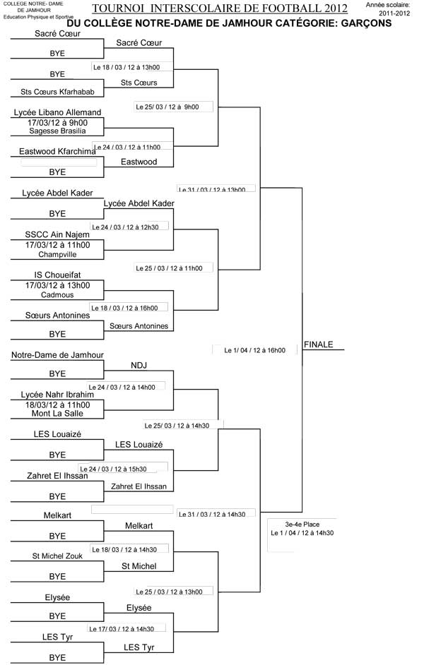 Le tournoi interscolaire de football organisé par le Collège et sponsorisé par Fransabank débutera le samedi 17 mars 2012 et prendra fin le dimanche 1er avril 2012.
