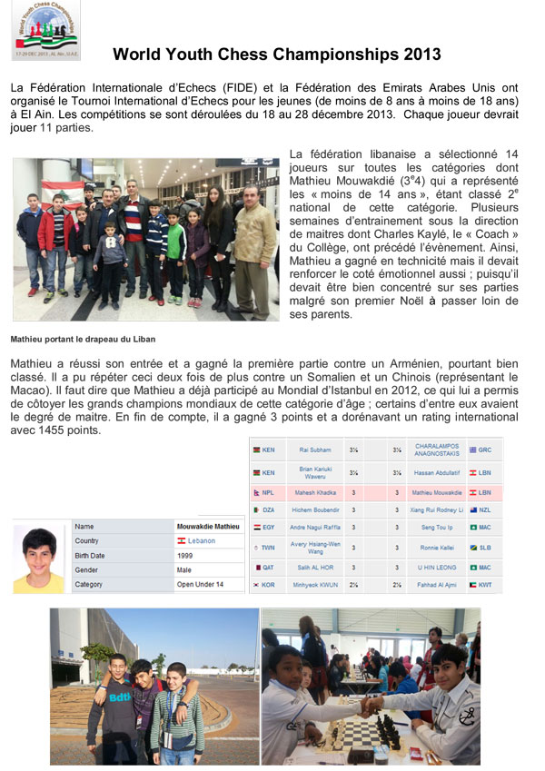 La fédération libanaise a sélectionné 14 joueurs sur toutes les catégories dont Mathieu Mouwakdié (3e4) qui a représenté les « moins de 14 ans », étant classé 2e national de cette catégorie. Plusieurs semaines d’entrainement sous la direction de maitres dont Charles Kaylé, le « Coach » du Collège, ont précédé l’évènement. Ainsi, Mathieu a gagné en technicité mais il devait renforcer le coté émotionnel aussi ; puisqu’il devait être bien concentré sur ses parties malgré son premier Noël à passer loin de ses parents.