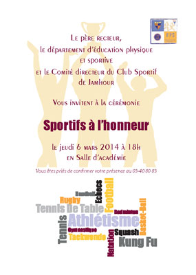 Le père recteur, le département d’EPS et le comité directeur du club sportif de Jamhour ont organisé, le jeudi 6 mars 2014, à 18h00, en salle d’académie, la cérémonie Sportifs à l’honneur pour la saison 2013, pour honorer les championnes et les champions du Liban à savoir : nos 126 sportifs, qui ont représenté le Collège, le Club et le Liban à l’étranger ainsi que ceux qui ont pulvérisé les records du Liban de leurs catégories.