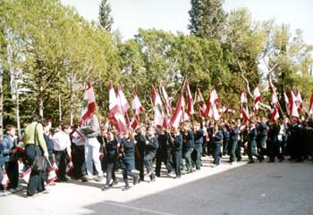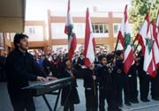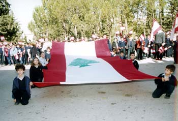 Tous les enfants trépignaient sur place, brandissant les jolis petits drapeaux libanais dont ils étaient si fiers. Ils attendaient impatiemment le début de la cérémonie. La fête commença à 11h 40 avec une superbe musique entraînante. Une vingtaine d'élèves présentèrent le défilé du drapeau, exécutant ainsi une marche militaire très applaudie. Le présentateur du programme annonça "l'Hymne National"précédé du chant "Demain à l'aube", le mot des élèves, puis le remarquable historique du drapeau libanais. Avant de clôturer la cérémonie, le Révérend Père Recteur prononça une allocution qui raviva dans nos cours l'Amour de notre patrie et la fierté de lui appartenir. Enfin, le clou de la fête fut la déclaration du résultat du "Concours sur le patrimoine libanais" par Sœur Christiane-Marie Melhem et la distribution des prix par le Révérend Père Recteur.