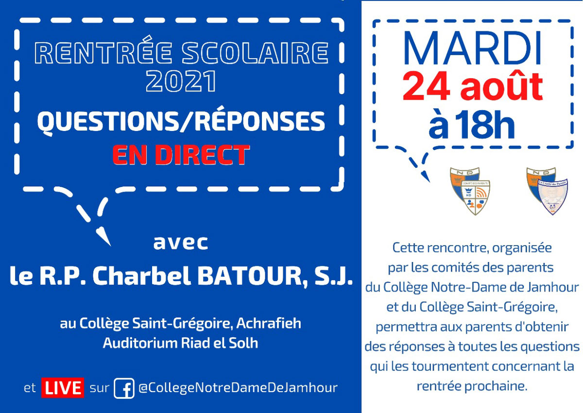 Cette rencontre, organisée par les comités des parents du Collège Notre-Dame de Jamhour et du Collège Saint-Grégoire, permettra aux parents d'obtenir des réponses à toutes les questions qui les tourmentent concernant la rentrée prochaine.