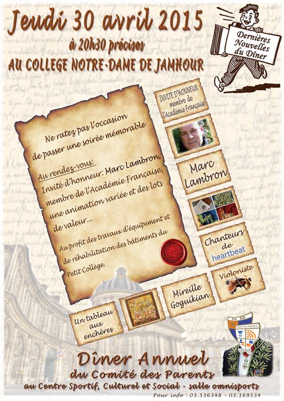 Le Comité des Parents a le plaisir de vous annoncer la date de son dîner annuel le jeudi 30 avril 2015 à 20h30 dans la Salle Omnisports - Espace Joe Saradar du Centre Sportif Culturel et Social du Collège. Nous vous invitons à réserver d’ores et déjà cette date.
