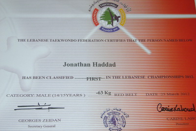 Après trois victoires Catégorie 14/15 ans ceinture rouge, j'ai remporté la médaille d'or avec un certificat First in the Lebanese Championships 2012 et la ceinture noire. Ce succès m'a poussé à continuer dans cette discipline qui me tient à cœur.