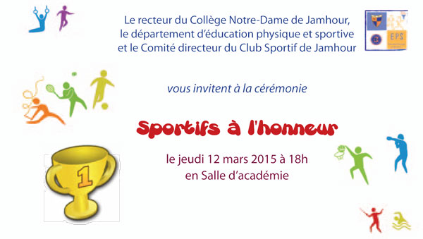Le jeudi 12 mars 2015, le Révérend Père Recteur, le département d’EPS et le Comité Directeur du Club Sportif de Jamhour ont organisé la cérémonie Sportifs à l’honneur 2014 pour honorer les championnes et les champions du Liban, les recordwomen et les recordmen, ainsi que ceux qui ont représenté le Liban à l’étranger.