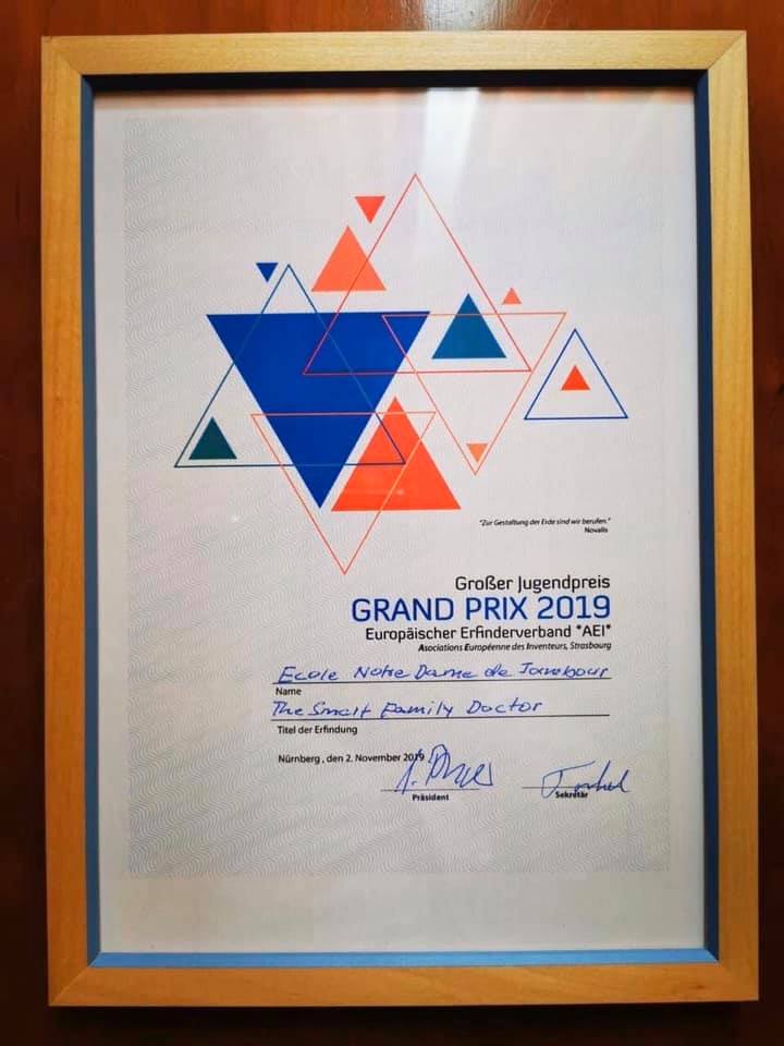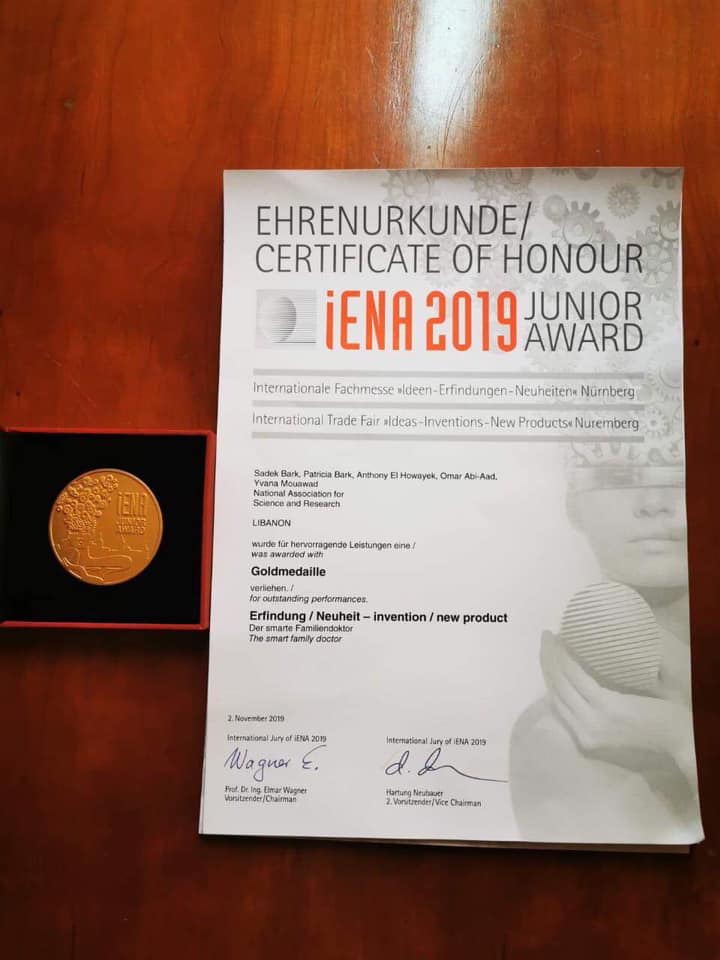 Du 31 octobre au 3 novembre 2019, 4 élèves du Collège Notre-Dame de Jamhour, Patricia Bark (4e2), Anthony el Howayek (4e1), Omar Abi-Aad (3e3) et Yvana Mouawad (3e5), encadrés par M. Sadek Bark, coordinateur de technologie au Collège, ont participé au Salon international de l'invention IENA à Nuremberg. Ils ont remporté une médaille d’or de la Catégorie Juniors ainsi que le Grand Prix 2019 de l’Association Européenne des Inventeurs, Strasbourg.